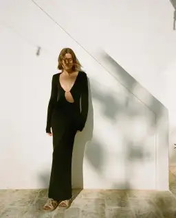 The Kinetic Beaded Maxi Dress in black is a long-sleeved, full length dress featuring a plunging neckline and cutout with beaded detail at the front. Crafted from a form fitting knitted fabric for a slim fit, pair yours with bold earrings for your next special occasion.