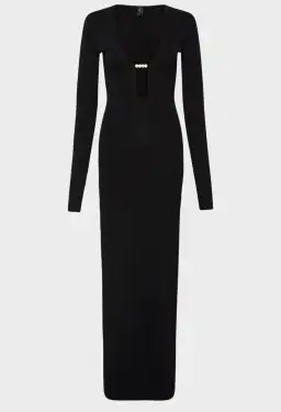 The Kinetic Beaded Maxi Dress in black is a long-sleeved, full length dress featuring a plunging neckline and cutout with beaded detail at the front. Crafted from a form fitting knitted fabric for a slim fit, pair yours with bold earrings for your next special occasion.