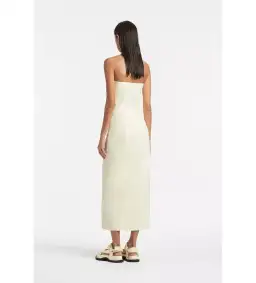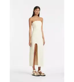 Sir the Label's seamless tailoring and a timeless shade define the Marco midi dress. Centred around flattering the figure, this long, strapless design's Italian suiting fabric is shaped by the structured neckline, internal boning and sharp front slit. Channel its minimalism throughout the look with a dainty gold choker and neutral sandals.