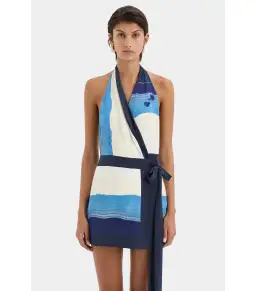 In a best-selling silhouette, the Mariner Wrap Halter Mini Dress is crafted from a silk crepe featuring our Shoreline Stripe print inspired by undulating seascapes. Designed with a softly draped shape that wraps around the waist and an open back.