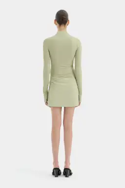 The Milesi Drape Mini Dress in Moss blends form-fitting stretch jersey with fluid silk viscose for a matte finish. It features a high neck, gathers through the body, a draped skirt overlay detail and thumbholes for a contemporary look.