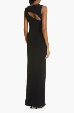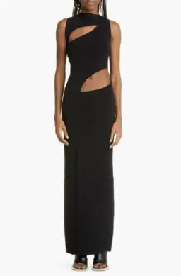 The Nadja cut out dress in black is a slim-fitting maxi dress crafted in a sculpting, knitted fabric. Featuring asymmetric cutouts, this dress can be worn reversible if you prefer more coverage through the front.