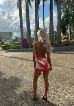 A modern shape, crafted from a silk fabric with a shiny finish, in the mariposa lily print, a red and white floral print exclusive to SIR. Featuring a draped silhouette with a wrapped waist and an open back detail. Designed to be worn as both a mini dress or over a pant.