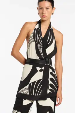 The Realisme Wrap Halter Mini is a modern shape, crafted from a naturally sourced silk crepe in the Papier print, an abstract monochrome print exclusive to SIR. Featuring a draped silhouette with a wrapped waist and an open back detail. Designed to be worn as both a mini dress or over a pant.