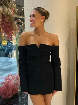 The Sandrine Tailored Mini Dress is a modern dress, crafted from a premium Italian suiting fabric. Inspired by the shape of a blazer, this style offers an off-shoulder fit with a single breasted design, punctuated waist, and front welt pockets. Featuring an internal corset to provide a structured look, pair yours with heels for your next occasion.