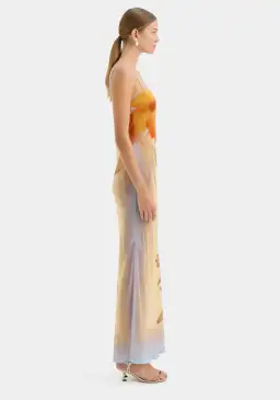 The Serene Slip Dress is a floral maxi dress defined with a straight neckline, slender straps and a bias cut fit for timeless appeal. Crafted from a lightweight silk crepe fabric in the SIR. exclusive Sequoia Floral with large-scale florals and ombre borders, uniquely placed on each garment.