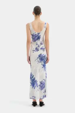 The Sofia Slip Dress in Nuvola Print is crafted from lightweight silk viscose, cut on the bias for an elegant drape. It features a scoop neckline with a mesh trim detail along the neckline and armholes.