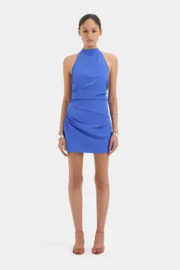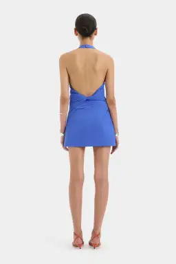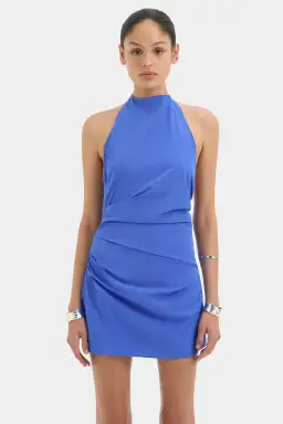 The Sol Halter Mini Dress in Cobalt is an event mini dress crafted from form-fitting stretch nylon with a technical hand feel. It features a halter neckline, soft tucks through the body, and a twist detail at the back.