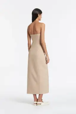 Sir The Label Tan Monte Strapless Dress. Midi length. Internal boning. Princes panel seam. Contrast trim throughout. Fitted. Lined. Front split. Midnight soft Italian suiting fabric. Invisible zipper at side.