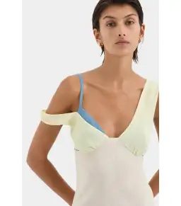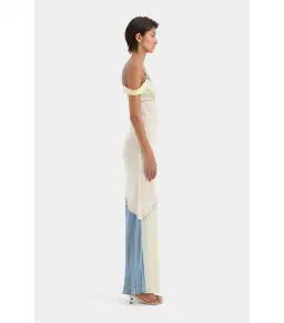 The Thames Splice Midi Dress is a modern slip silhouette, crafted from lightweight semi-sheer silk chiffon and colour-blocked in ecru and blue. Cut on the bias for a flattering fit, it features an asymmetric bust overlay that softly drapes off the shoulder and a panelled semi-sheer skirt defined with a split at the side. Ready for your next event.