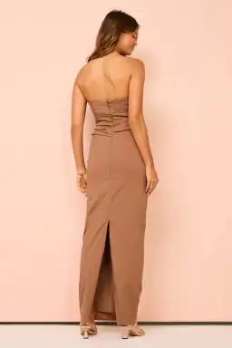 The Alba Strapless Gown in Mocha is a feminine and modern silhouette, ready for your next occasion. It features a strapless sweetheart neckline, underwired bustier, centre back split and tucks through the body for a tailored look. Crafted from brown Italian stretch cotton offering ruching through the waist to ensure a flattering fit.