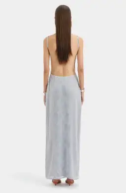 The Ventura Gown in Silver is defined with a statement open back, straight neck and thin straps. It features a large-scale floral burnout artwork on silk with a velvet pile over a sheer mesh base. Style with the removable slip for styling options.