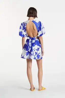 The Vivi open back mini dress is a classic SIR. silhouette crafted in a lightweight silk/cotton in our exclusive Merce abstract print. Featuring exaggerated puff sleeves, an elasticated waistband and open back tie detail.