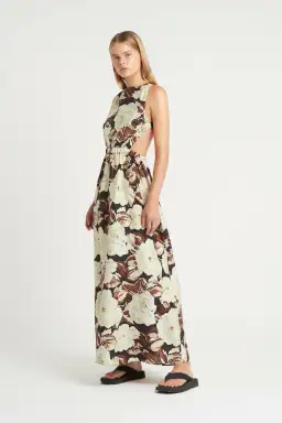 A high neck open back silk gown cut in SIR's exclusive Vivienne print with an elasticated waist and cross over back detail. Elasticated back cross straps. Elasticated waist. Unlined. A crisp natural raw silk that is luxurious and holds its shape .