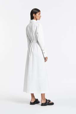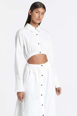 Sir The Label White Ilkin Deconstructed Shirt Dress. Size 1/ 8 AU / 4 US. RRP $450. Maxi length. Collar and stand. Centre front placket. Waist placket. Shaped front hem wide cuffs. Side slit pockets. Italian poplin. Unlined. Button closure at center front. Cutout at waist. Top and skirt can be worn separately. Buttoned cuffs. Fit and flare silhouette. 92% cotton; 8% polyamide.