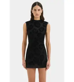 The Vittoria Mini Dress in Midnight Floral is an event silhouette crafted from semi-sheer stretch burnout fabrication with a floral velvet artwork throughout. It features a sleeveless design, high neckline, soft gathers and sheer bind detailing along the edges.