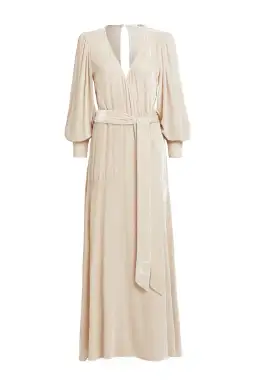 Made from a sand-coloured silk velvet, this maxi length full skirt wrap-around dress features a plunging neckline and keyhole back, billowy balloon sleeve, wide cuff detailed with self-covered buttons and elastic loops, with belt loops at waist. The removable wide sash belt allows flexibility in adjusting fits.
