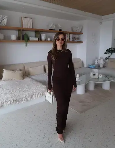 Elevate your evening wardrobe with the Sneaky Link Caterina Midi Dress in rich chocolate. Crafted for comfort and luxury, this dress features a refined boat neckline and long sleeves, perfectly suited for cooler nights. Its fitted bodice elegantly hugs and shapes the silhouette, offering a sophisticated blend of warmth and style.