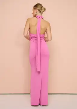 Crafted with a form-flattering silhouette in a romantic pink hue, this maxi is complete with a self-tie halter and removable rose brooch.