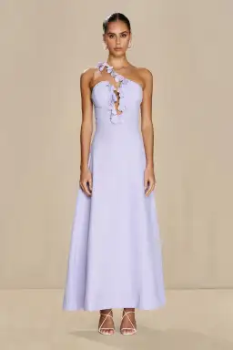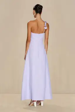 The Amal is crafted from a summer linen/silk blend in a soft lilac. Featuring a structured, keyhole design to flatter yet lift and support the bust. Artfully adorn the asymmetrical detail of the bust, with sweeping petals and gold beaded detail across the neckline.
