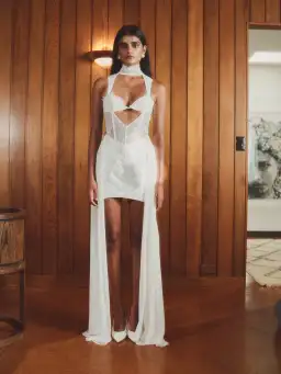 Introducing Arabella — a statement silhouette crafted from vintage-inspired lace and contrasting taffeta. Featuring waist cut-outs with structured boning, a pleated mini skirt, and draped chiffon side panels, she’s designed to turn heads. Paired with matching gloves, Arabella is made to leave a lasting impression for the modern bride.