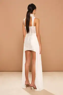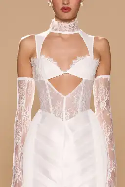Introducing Arabella — a statement silhouette crafted from vintage-inspired lace and contrasting taffeta. Featuring waist cut-outs with structured boning, a pleated mini skirt, and draped chiffon side panels, she’s designed to turn heads. Paired with matching gloves, Arabella is made to leave a lasting impression for the modern bride.