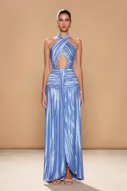 The Ariana Dress is a striking blend of elegance and allure, featuring a pleated, flowing silhouette with a captivating halter neckline. The intricately ruched bodice and daring cut-out details create a bold yet sophisticated look, while the slit adds a touch of drama for a striking, sophisticated finish.
