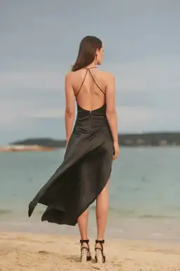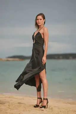 Features an open-back with a unique low plunging embellished key-hole which brings a sense of allure. Cut from a light satin with adjustable slender straps, that cross over the back.