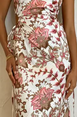 Crafted from a silky to touch fabrication, this maxi dress features a strapless neckline, fitted silhouette side waist cut outs and is finished with an alluring side split.