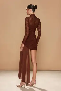 The Mariposa Dress blends romantic detail with refined sophistication. Featuring a delicate lace bodice with a high neckline and sheer long sleeves, the fitted ruched mini silhouette is finished with an asymmetrical chiffon drape—adding fluid movement and a touch of drama.