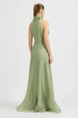 The Sonya Moda Noelle is a maxi-length gown crafted from a luxurious organza silk with an elegant neckline artfully adorned with hand-sewn pressed floral appliqué. The skirt flares out on the bias with a modest slit creating graceful and exquisite movement.