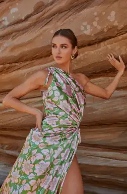 Make an entrance in this captivating signature SONYA number. The Nour dress demands attention from first glance. It features an elegant one-shoulder neckline, high split and a minimalist silhouette that’s artfully adorned with fabric play and cutout which tapers in at the waist.