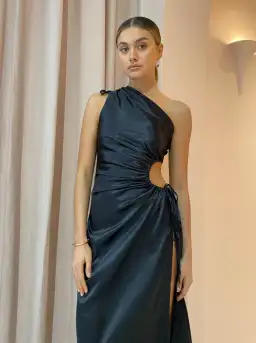 Thoughtfully crafted from a luxurious silky fabrication, this one shoulder maxi silhouette features an adjustable cutout at the waist with sculptural ruching and a high split for a figure skimming fit.