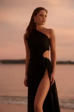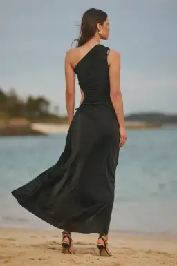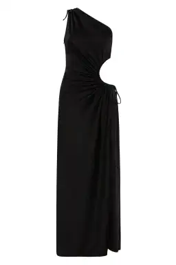 Make an entrance in this captivating shimmering signature Sonya number. This floor length dress features a one-shoulder neckline, high spilt and a minimalist silhouette that's artfully adorned with fabric play at the hip. the adjustable cutout forms a beautiful ruching details to accentuate the female curves. Cut from a sparkly lurex yarn