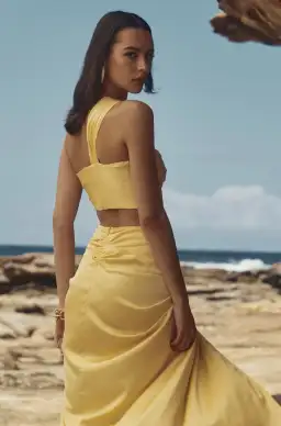 A feminine silhouette designed to hug your curves. The Petra Skirt features an effortless, minimalistic silhouette that’s heightened with gorgeous ruching detail at back and beautiful sweeping fabric gathered on the hip which opens out into a high split and a flattering midsection. Paired with the matching one-shoulder Petra top which showcases the feminine figure beautifully.