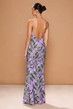 Features a cowl neckline before artfully contouring the figure on the bias. Its striking floral print inspired by the vibrant blooms of Capri demands attention whilst exuding elegance. Fusing sophistication, sass, and sensuality, the true showstopper lies in the plunging back, adding a touch of allure for a lasting impression.