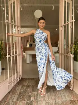 The Sonya Nour Maxi Dress in Blue Paisley. Cut from a silky to touch fabrication, this stand-out maxi dress features a one-shoulder neckline, a high split and signature cut-out detailing on the hip. Finishing in an elegant maxi length, love this statement maxi dress for cocktail parties, summer festivities and birthday celebrations.