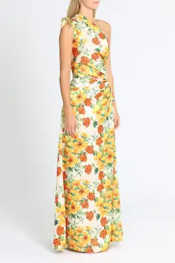 Make a statement in the Nour Yarden Floral Maxi dress from the moment you step into the room. Its sensual one-shoulder silhouette boasts structured ruching to highlight a feminine shape, along with an adjustable tie at the waist/hip and a high split. Perfect for the races, date night, or a garden wedding.