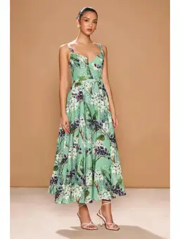 Green, Maxi Floral dress made from Silk and Linen blend with fitted bustier.
