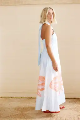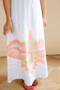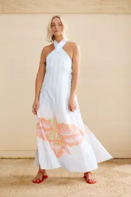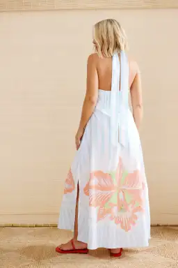 Hibiscus are an indigenous flower of Africa with over 60 species found in the South alone. We love tucking them behind our ear, sipping Sorrel. A popular African perfectly refreshing hot day drink made of boiled hibiscus, that not only tastes amazing but is is super healthy. Not unlike this dress. So refreshingly perfect you will make everyone smile as you walk into a room. Prettiest summer pastels in a semi fitted halter neck A line super flattering silhouette that suits everyone. Just add beautiful skin and fresh hair and a smile. And a healthy drink. Or a cocktail. Summer loving had me a blast & a really beautiful dress.
