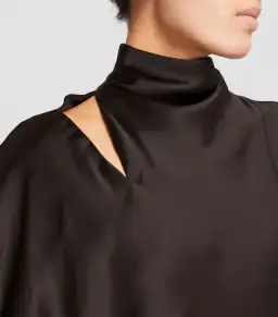 "The Sorrell is draped from glossy satin into a longline silhouette that finishes just below the ankles. This Evening dress demonstrates soft clean finishes while being detailed with a cut-out on the shoulder and cowl-style draping on the neckline.