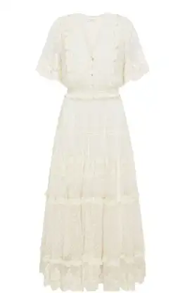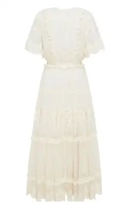 With its four contrasting lace tiers from the waist and shell buttons at the bust, the Dawn dress is an exquisite piece. Fully lined with a V Neckline, full elasticated waist and ladder trim inserts, the dress is signature Spell style. Crafted in a cotton/nylon blend, with a front and back yolk, scalloped hem and gathers on the sleeve.