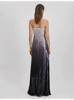 The Spencer strapless maxi dress is designed with sequins in an ombré arrangement. Internal boning ensures a flattering fit around the chest before falling to a floor-length finish. Sequin fabrication ombré design internal boning zip closure to reverse lines.