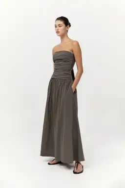 St. Agni Gathered Strapless Tie Back Maxi Dress in Khaki Size S/AU 8