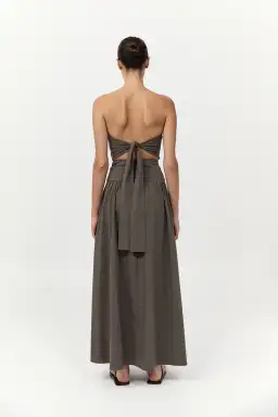 The Gathered Strapless Tie Back Dress falls to a maxi-length silhouette with an A-line skirt, offering a refined, yet effortless look. Side boning at the torso provides structure, while delicate gathering details add a soft touch. The back is complemented by a striking tie detail. The Gathered Strapless Tie Back Dress is destined for high rotation wear.