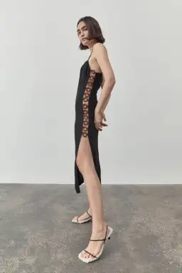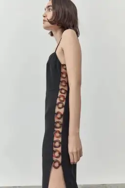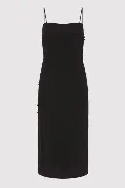 Constructed from a breathable mid-weight Viscose. A midi length silhouette featuring a straight neckline, slim straps and open tortoiseshell rings that cascade the ribcage.