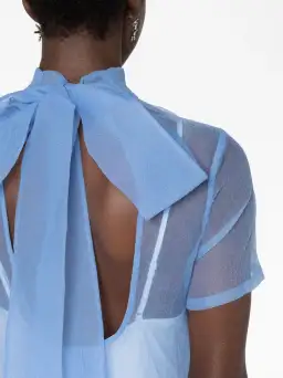 Light blue Staud calluna dress. Sheer outer layer with slip included. Floor length dress with bow at the back.
