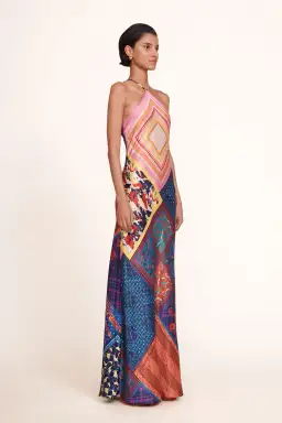 A fitted bias maxi dress in a patchwork scarf pattern. The Cubism Dress features a halter neckline and adjustable crossover straps at the back. A perfect piece to make a statement!