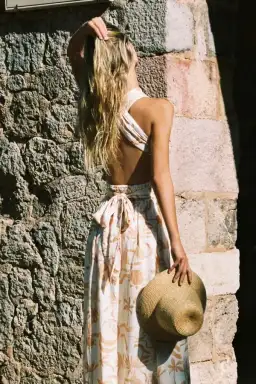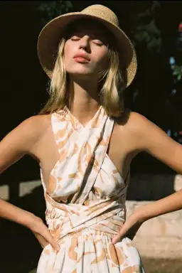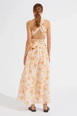 The Dominique Dress embraces summer vibes and nostalgia with its sandy, tropical print. Featuring a convertible, halter-neck design (that can be worn multiple ways) and low cut back - this linen dress is beloved for summer weddings and cocktail hour. Style with your favourite sandals or heels for effortless glamour.