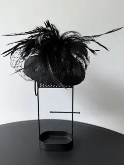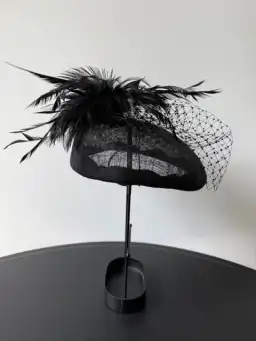 Morgan and Taylor Straw Beret Millinery with Feathers and Veil Black One Size